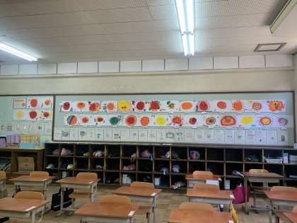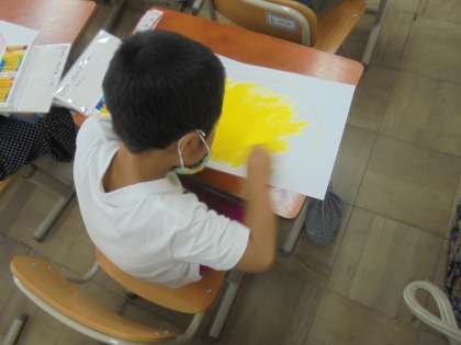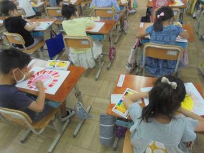 テーマは「おひさまにこにこ」 それぞれ,自分が思う形,色のおひさまを画用紙いっぱいに描いていました。
