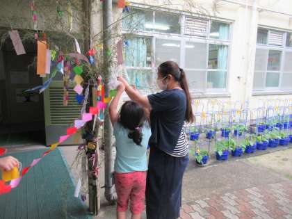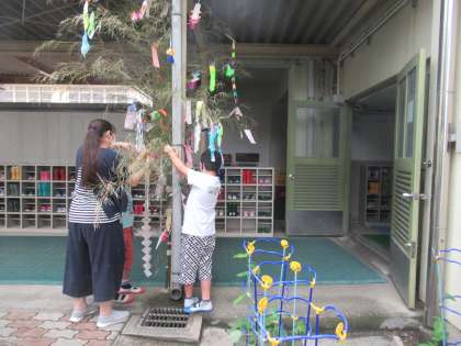 7月7日の七夕の日,あいにくの天気でしたが,ひまわり学級の子どもたちは,とてもすてきな飾りや短冊を笹にかざりました。