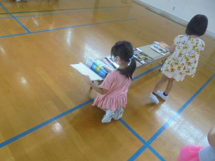 今日は体育館が本屋さんに!選書会がありました。体育館いっぱいに本が並べられ,興味のある本を中心に,楽しそうに本を選んでいました。