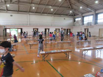 体育館にずらりと本が並びました。選書会です。図書館に入れてほしい本を全校児童全員が選びました。教職員も選びました。どの子も,本に夢中になっていました。