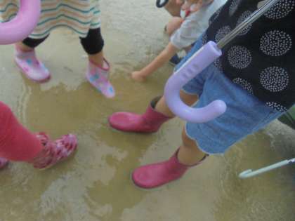 子どもたちは水や泥の感触を楽しんだり,雨の音を楽しんだりしていました。