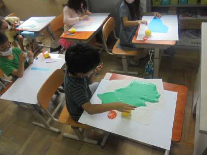 図工の学習で,やぶいた紙の形から想像したものを絵にしています。