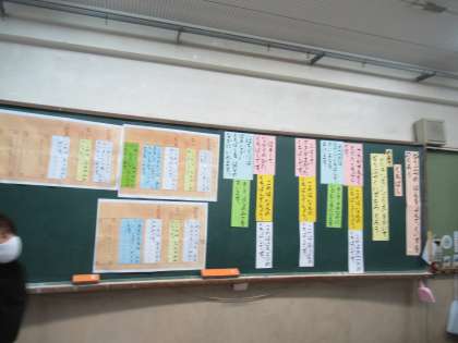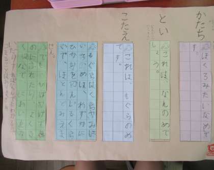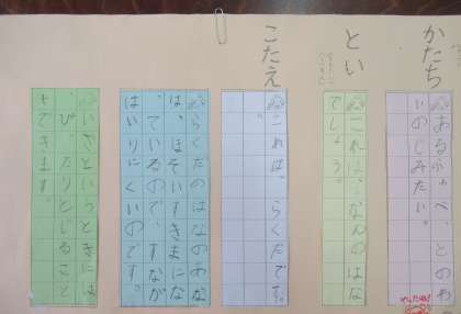 「くちばし」の学習で,文章の組み立てを基にして,自分で選んだ本の内容をクイズにしました。組み立てを意識するために,色カードを使ってクイズを書くようにしました。
