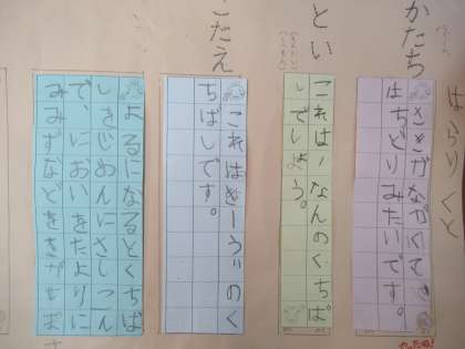 できあがったクイズを読んで,みんなに答えてもらっています。自信をもってクイズを読み,楽しんでいます。この学習で,図鑑や科学的読み物を楽しく読むことができました。