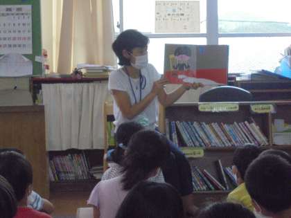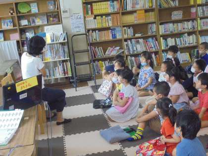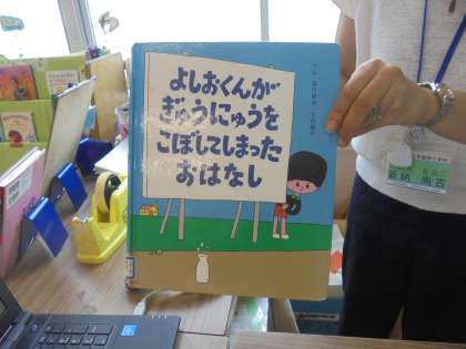今日は学校図書館司書の新納先生に本を読んでいただきました。題名は「よしおくんが ぎゅうにゅうを こぼしてしまった おはなし」