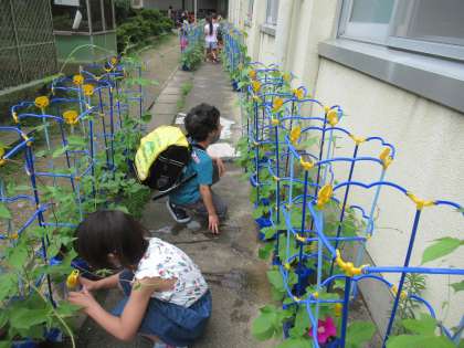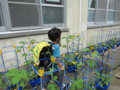 「ぼくのあさがお,咲いたかなあ・・・。」と思いながら,登校してまず自分のあさがおを見に行きます。心の中で「早く咲いてね。」「元気で生長してね。」とあさがおと会話をしています。