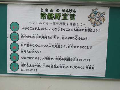 いじめのない学校にするために,ずっといじめがないように,児童会がつくった「常磐野宣言」。みんなが通る掲示板に,大きく掲示しています。