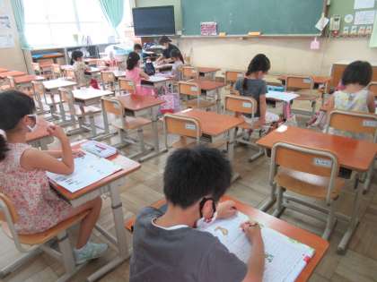 1年生は,初めての頑張り勉強です。教室で自分の持ってきた課題に集中して取り組みました。きれいに字を書いて,よくがんばっていました。