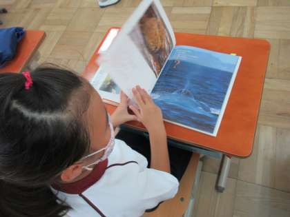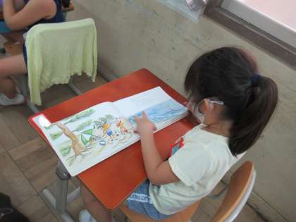 「本を読んで待ちましょう。」の指示で,教室にある本を選び,じっと本に集中することができました。「この本好きやねん。国語の勉強で読んで好きになった。」と教えてくれる子もいました。1学期に学習した「くちばし」の学習で出会った本がお気に入りになったそうです。笑顔で何度も読み返していました。