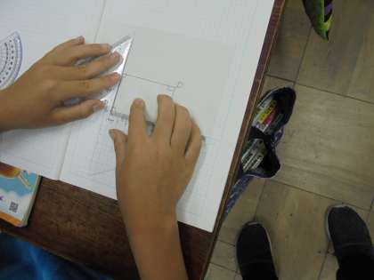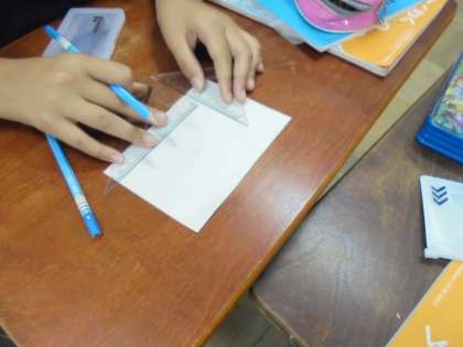 三角定規での垂直と平行の線の引き方を使って,長方形をかく方法について学習しました。それぞれの考え方を交流しながら,考えを深め合いました。