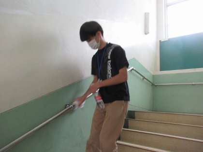 2学期が始まり,1学期と同様に,毎日,手すりなどの子どもたちが触れるところの消毒作業を行っています。