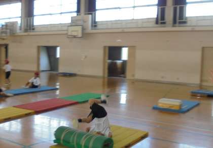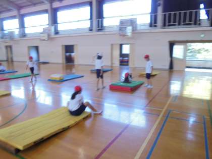 それぞれのめあてにそった活動の場で,活動をしています。とび前転や側方倒立回転など,自分のめあてに向けて頑張っています。