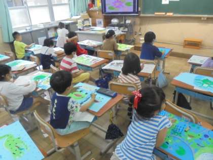 出てくるいきものが,どのような会話をしているかを想像しながら,楽しく描いています。できあがりが楽しみです!