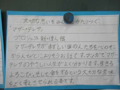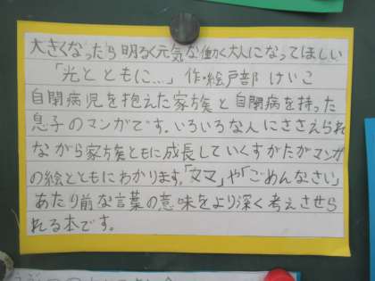 ノンフィクションの本を読み,感じたことや考えたことを大事にして,紹介文をポップにする活動をしました。一生懸命がんばりました。