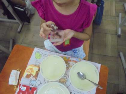 今日の給食には「おはぎ」が出ました。苦手だという人やあまり食べたことがないという人もいましたが,「食べてみたらおいしかった!」という子も多かったです。