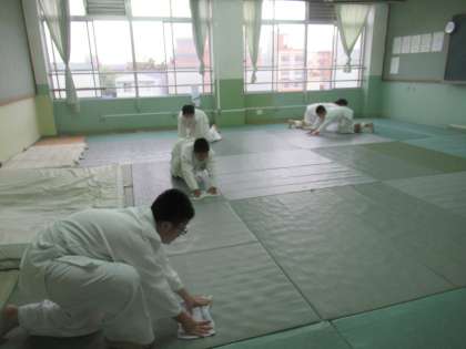練習の締めくくりには,柔道場をきれいに掃除して,気持ちを引き締めていました。