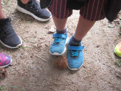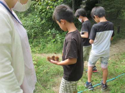 ネイチャーランドのクリに,夢中になっている子どもたちがいます。落ちてきたいがぐりを拾って,中の身を取り出そうと工夫して四苦八苦していました。きれいなクリの実がとれた時,「先生,あげるわ。きれいやろ。」と言ってプレゼントしてくれました。そして,放課後,「さっきのクリ,やっぱり返して。」と言いました。大事に持って帰ったのかな。