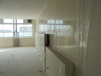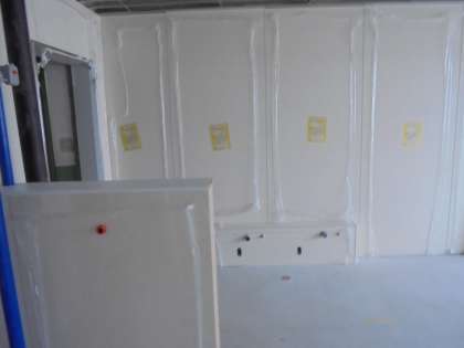 配管工事の後の現在は,壁面のパネルがつけられました。パネルが並び,明るいトイレの様子が見えてきました。