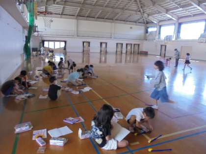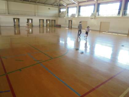 体育館で,ゴムの条件を変えながら,車が動く距離を調べました。子どもたちは,声をかけて,どれだけ進んだかを調べることができていました。