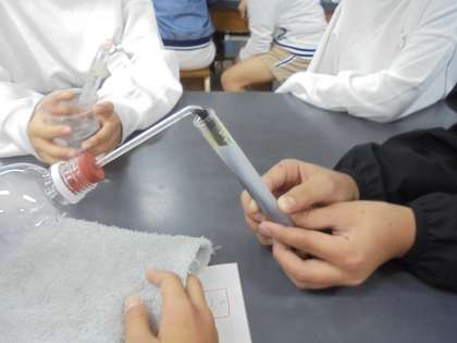 炭酸水にとけている気体について調べました。石灰水を使用し,白く濁ることを確認して,二酸化炭素が炭酸水にとけていることを理解していました。