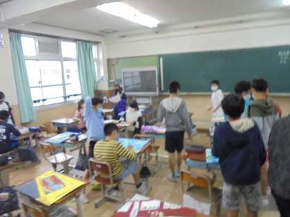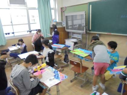 完成したお話の絵をお互いに鑑賞しました。それぞれのよいところを見つけて,ワークシートに書いていました。