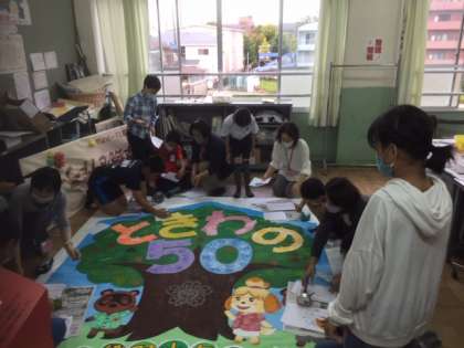 PTAの本部さんに大凧に絵を描いていただき,各学年から数人の児童が,葉をスタンプしたり,手形で模様をつけたりして仕上げていきました。
