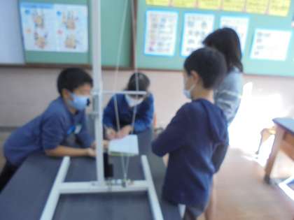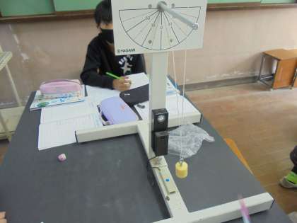 ふりこの糸の長さ,おもり,ふり幅などの条件を変えて,1往復の時間について調べました。