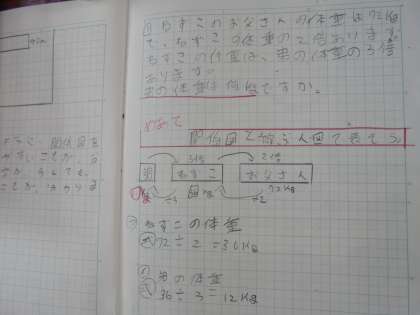 問題文から数量関係を考えて,もとの数量を求める学習をしました。もとの何倍なのかを関係図に表して考えました。