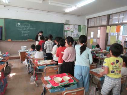 「おかわりほしい人,来てください。」という先生の呼びかけに,明るく並んだ子どもたち。「すごいなあ。元気やなあ。」と声をかけると,担任の先生が「おかわりが足りるか心配です。」とうれしそうに応えてくれました。おいしくしっかり食べています。