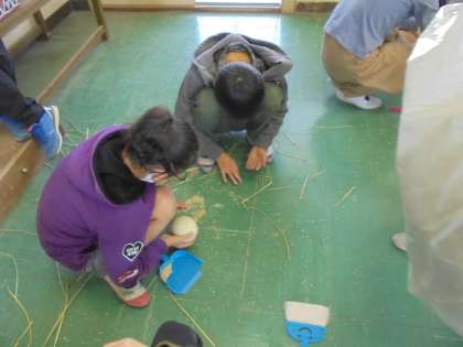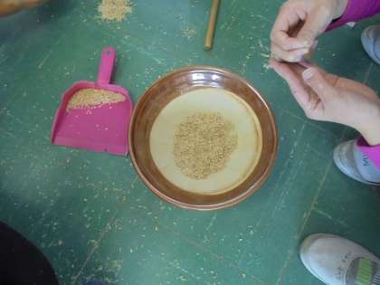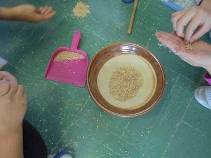 自分たちが作ってきたお米の種もみを行いました。大変な作業を根気よく頑張りました。