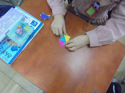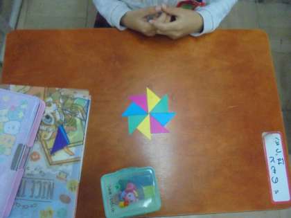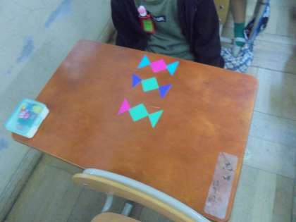 算数はかたちづくりの学習に入りました。今日は,色板を使って,いろいろな形を作りました。初級編から上級編まで,教科書にある形を楽しみながら取り組みました。ほかにも,自由に好きな形も作りました。