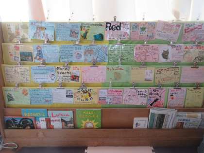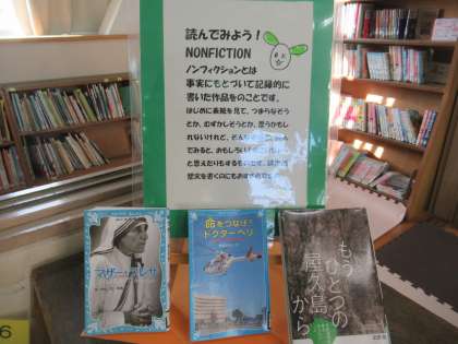 図書館には,教職員の方々のおすすめの本のポップがならびました。新しい本も置かれていました。ノンフィクションのコーナーもありました。
