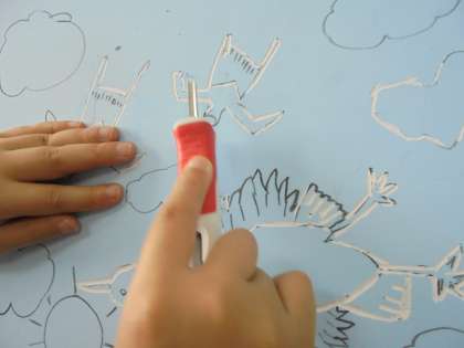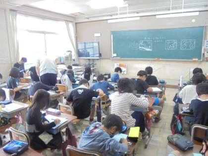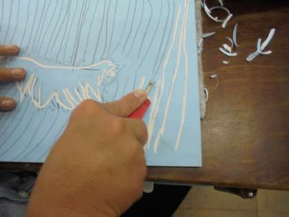 版画をしています。子どもたちは,線描したところをしっかりと彫り進めていました。