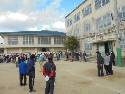 体育振興会会長と学校長の挨拶のあと,校内清掃の説明があり,多くの方々で清掃活動を始めました。