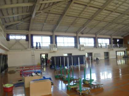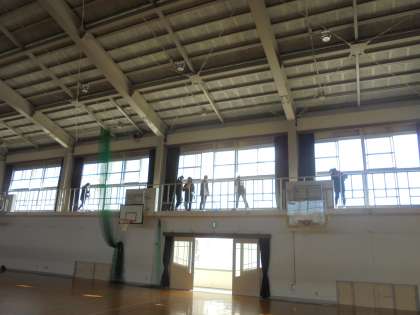 体育館では,各部屋に入っているものを全て一度出して掃除したり,子どもたちでは掃除できない高いところを掃いたりしていただきました。