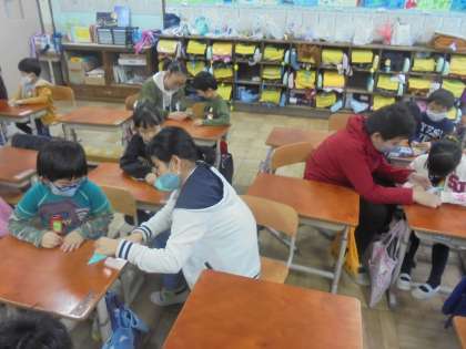 6年生が修学旅行で広島に行くにあたり,折り鶴を作ることになったそうです。そこで,全校で協力して,折ることになりました。そこで,1年生は朝学習の時間に,6年生と1年生の教室に分かれて6年生に折り方を教えてもらいました。