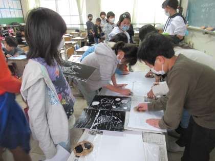 彫刻刀で一生懸命彫った作品に,インクをつけて印刷をしました。どんな作品に出来上がっているのか,わくわくしながら紙をめくりました。