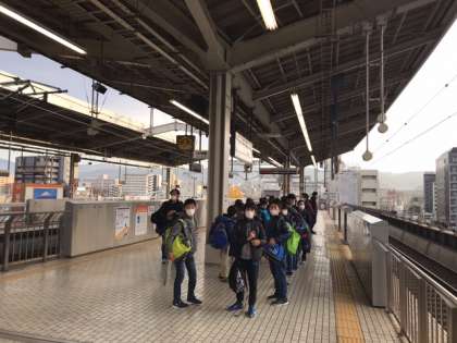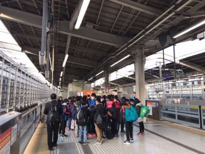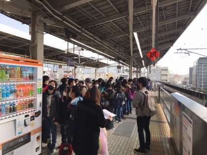 京都駅に到着しました。しっかりと並んで新幹線の到着を待っています。