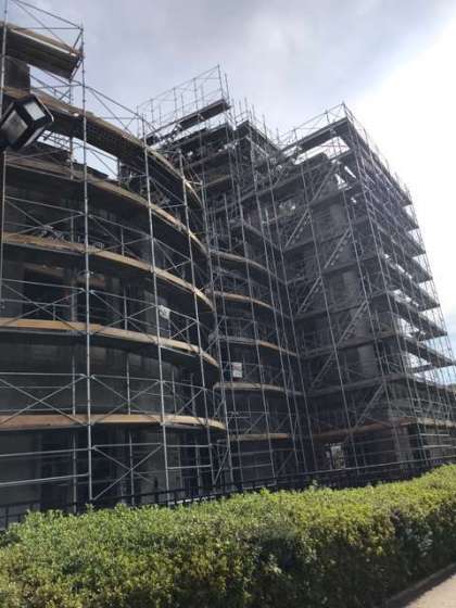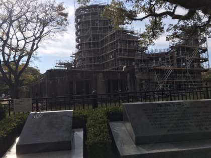 原爆ドームに到着しました。補修工事が行われていますが,補修の足場の間から見える原爆のドームの様子をしっかりと見ていました。