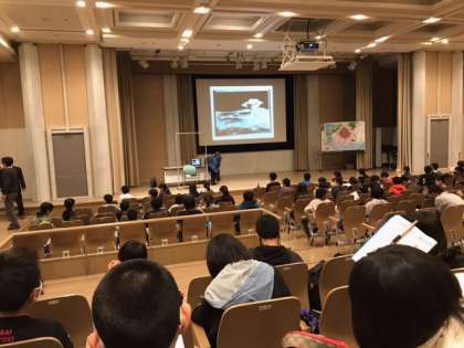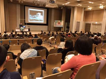 平和記念公園を散策した後,語り部さんのお話を聞いています。
