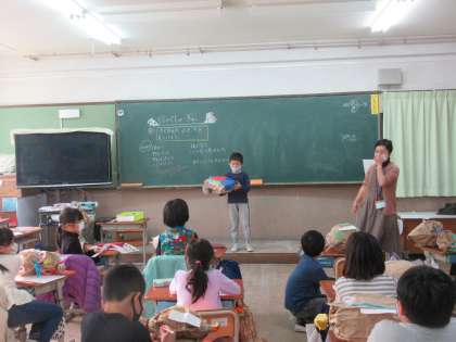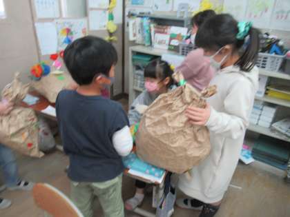 くしゃくしゃにした袋に,新聞紙などを詰め込んでギュッとしばった形を生かし,作品をつくりました。友達と作品を交流してよいところを見つけ合いました。みんなに,すすんで自分の作品を発表する姿も見られました。