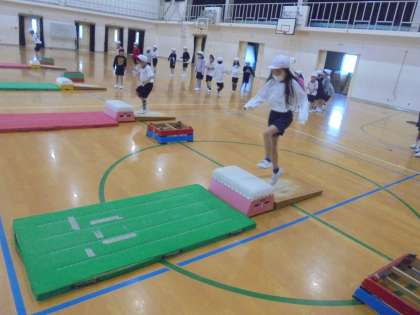 とびばこあそびが始まりました。今日はとびのり・とびおりやまたぎのり・またぎおりなどを中心にしました。手のつき方やタイミングなどをつかんで,開脚とびもできるようになっていきたいと思います。