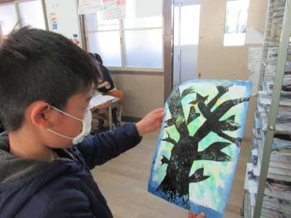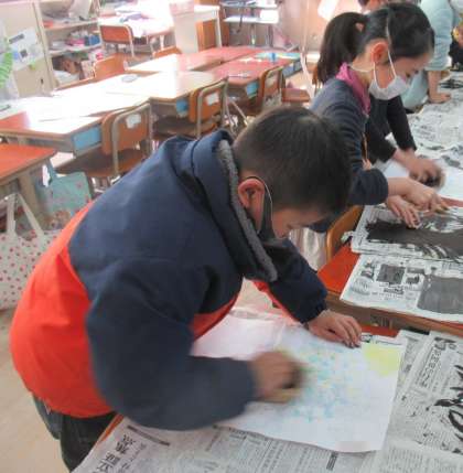 あらかじめ美しく色づけした和紙に,黒のインクで刷った木をうつしました。集中して活動しました。