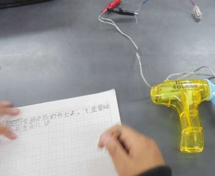 手回し発電機を使って,豆電球のつき方がどのように変わるのかを学習しました。