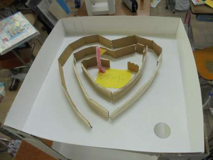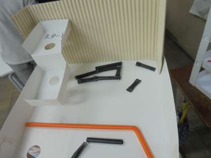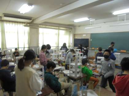 玉が転がって楽しむことができる作品を作っています。子どもたちのそれぞれの工夫がたくさん見られます。