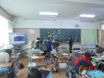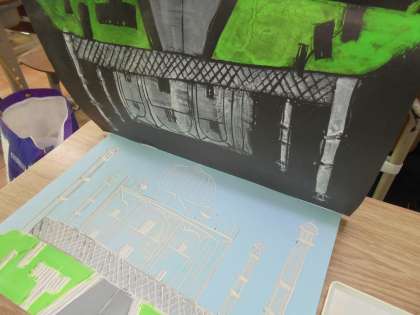 一版多色版画に取り組み,丁寧に色を塗りながら作品を仕上げています。