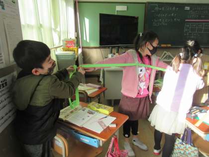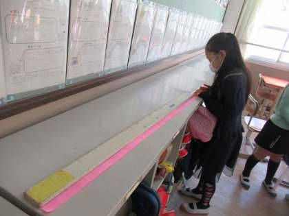 手を広げた長さは,どれくらいなのか予想してから,紙テープで長さをはかり,1mの物さしを使って何cmか調べました。