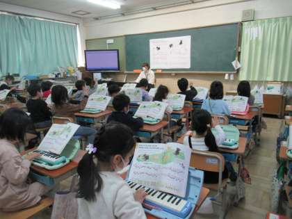 新型コロナウイルス感染症に気をつけるため,学校では,鍵盤ハーモニカは吹きません。先生のピアノに合わせて,指づかいだけ練習しました。よく頑張っていました。