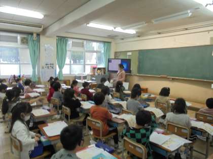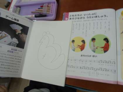 わらべうたを聴いたり,歌ったりして,楽しみながら学習をしています。絵かき歌を聞いて,自由帳に描きました。