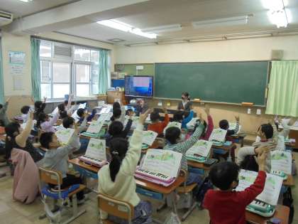 鍵盤ハーモニカを吹かずに,指の練習をしています。子どもたちはしっかりと指を動かして学習をしていました。